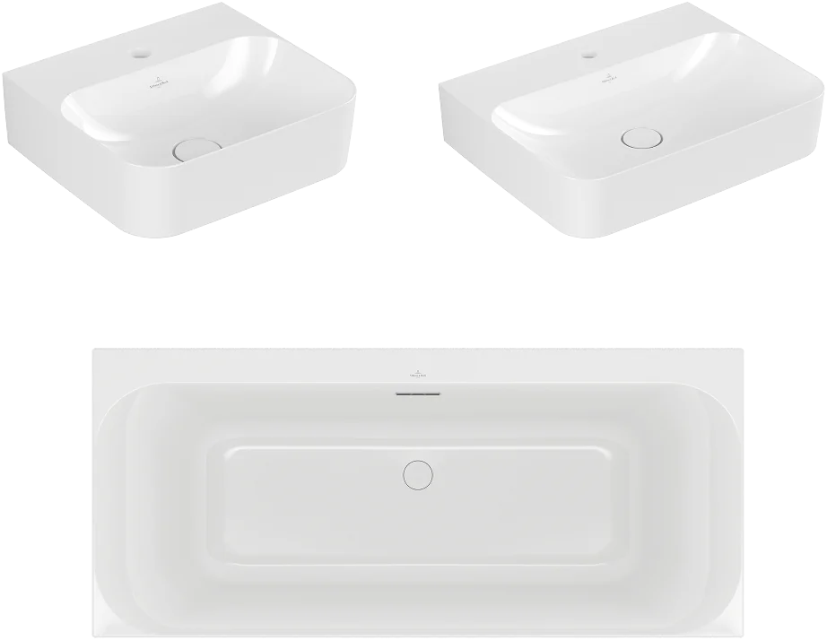 Die Sanitäreinrichtung umfasst Waschtische der Serie Villeroy & Boch Finion in den Größen 100 × 47 cm, 60 × 47 cm sowie ein Handwaschbecken 43 × 39 cm, jeweils mit Überlauf und aus hochwertiger Sanitärkeramik.